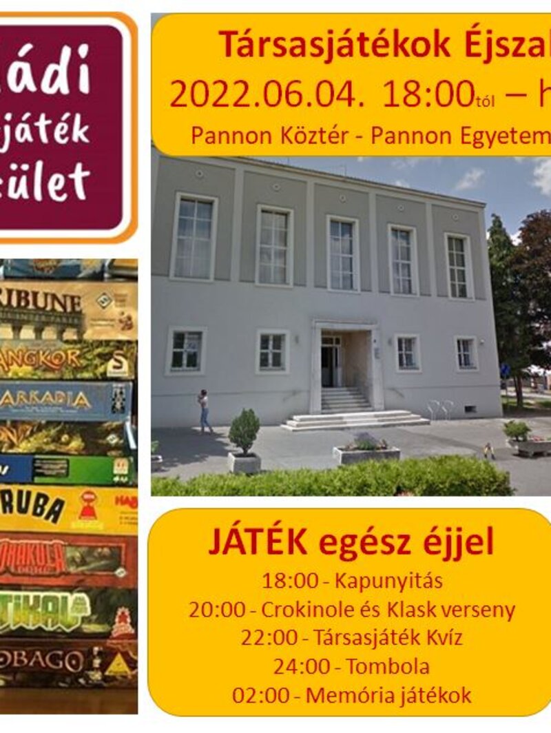 Játék egész éjen át! A társasjátékozásnak 2013 óta van nemzetközi ünnepnapja International Tabletop Day néven. Szeretnénk a világnaphoz csatlakozva saját hagyományt teremteni itthon. Tartson ez az esemény egész hajnalig és szóljon az egész nap és az éjszaka is a közös társasjátékozásról!